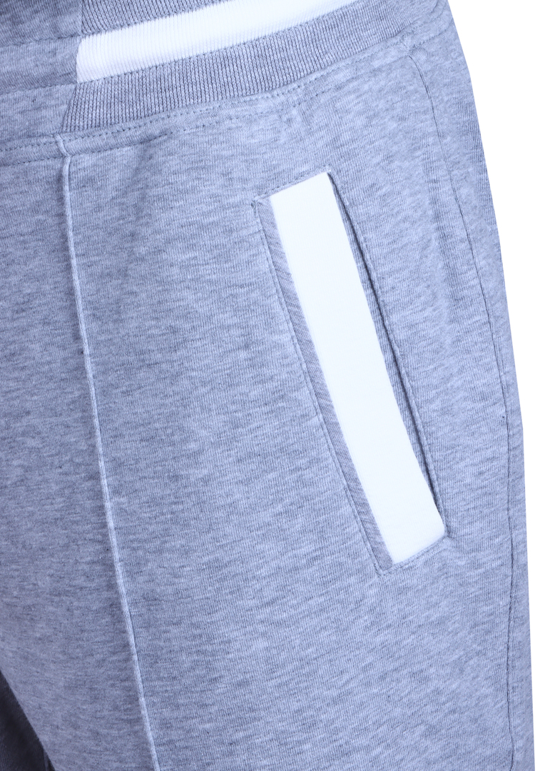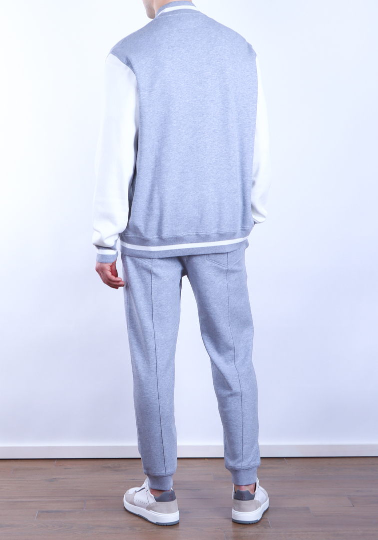 Брюки спортивные Brunello Cucinelli, серого цвета, выполнены из 93% хлопка и 7% полиамида, обеспечивая мягкость и комфорт. Ткань обладает легкой фактурой, подчеркивающей элегантность модели. Стиль брюк лаконичен и актуален для современного гардероба, они имеют стандартный крой с небольшим отворотом на манжетах, что придает изделию универсальность в сочетании с различными верхами. Боковые карманы украшены белыми полосками, добавляющими детализацию без лишней декорации.