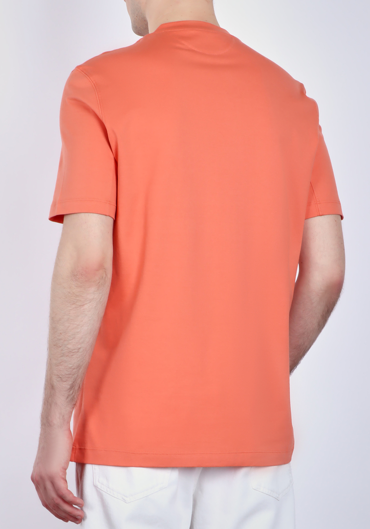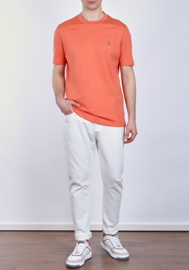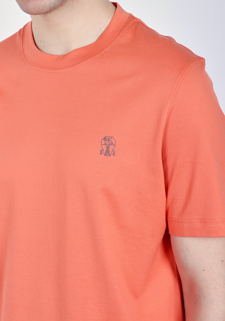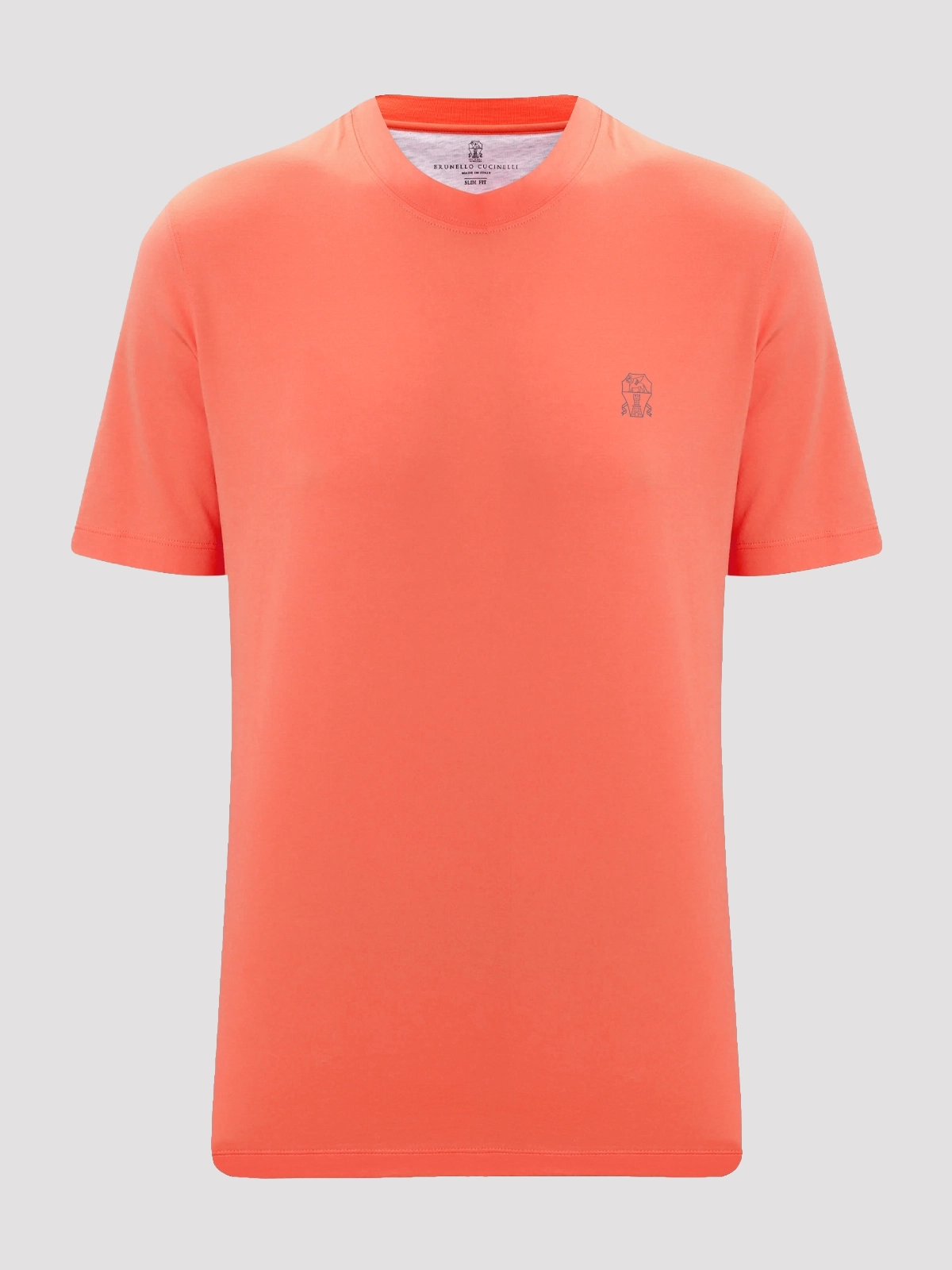 Футболка Brunello Cucinelli, цвет лосось, 100% хлопок. Лаконичная модель с классическим круглым вырезом и короткими рукавами, выполнена из мягкой хлопковой ткани. Декорирована небольшим вышитым символом бренда на груди. Стильная базовая вещь для современного гардероба.