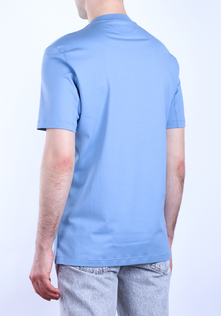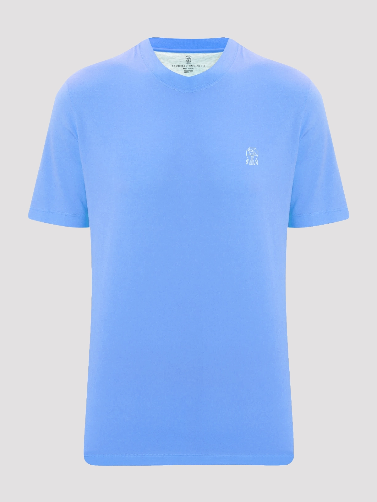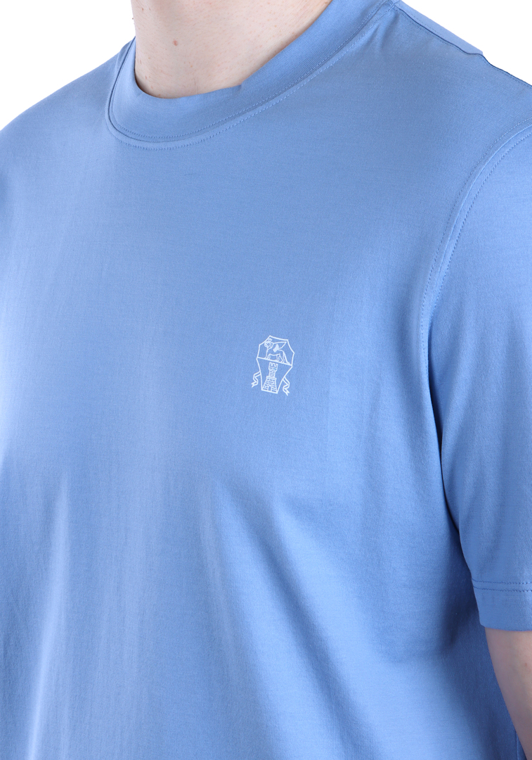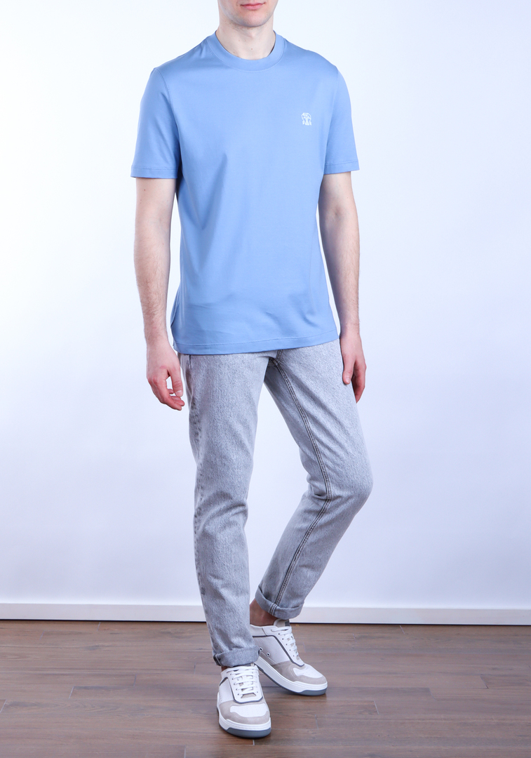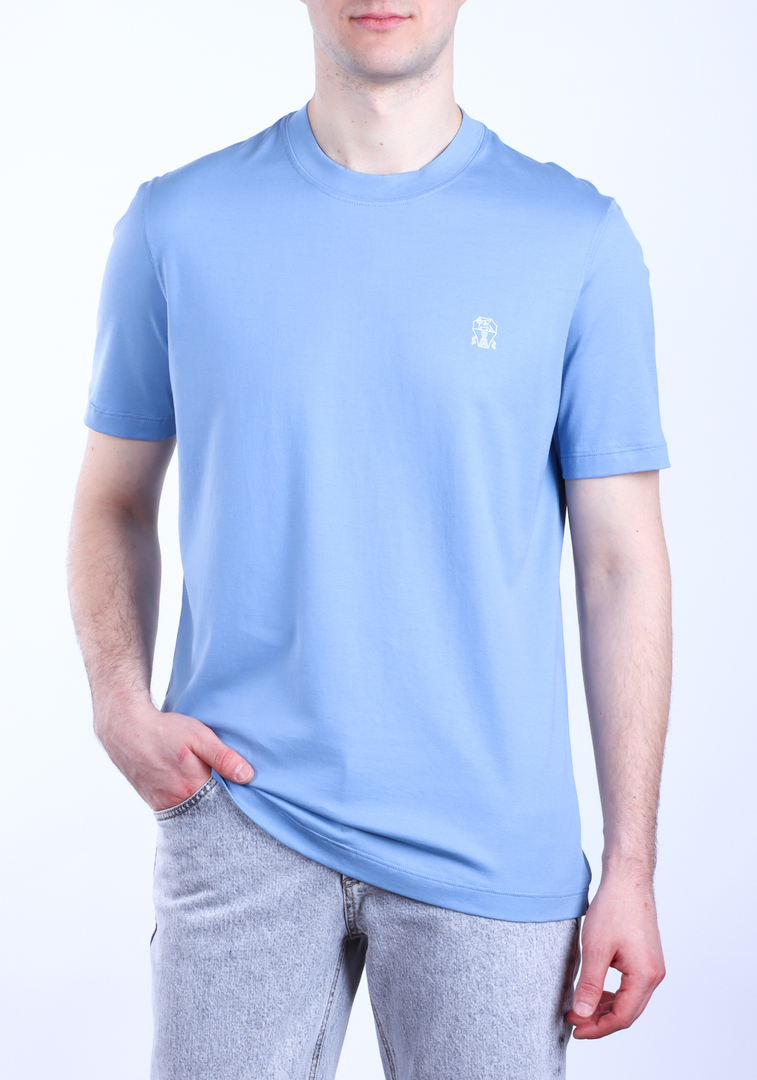 Футболка Brunello Cucinelli, цвет голубой, 100% хлопок. Лаконичная модель с классическим круглым вырезом и короткими рукавами, выполнена из мягкой, дышащей ткани. Декорирована небольшим белым принтом на груди, придающим элегантность простому силуэту.