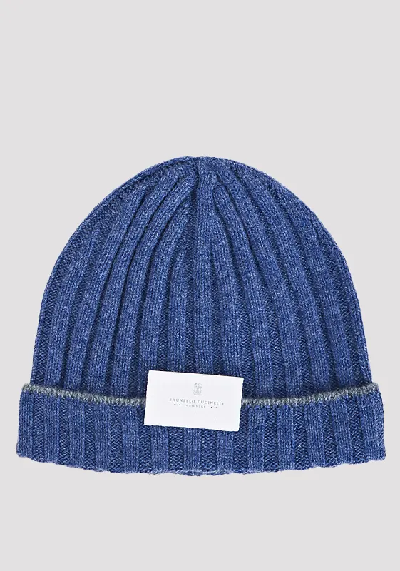 Шапка Brunello Cucinelli, цвет синий, 100% кашемир. Элегантная модель с рельефной фактурой и контрастным отворотом, подчеркивающим классический силуэт. Лаконичный дизайн и высокое качество делают эту шапку идеальным аксессуаром для осени и зимы.