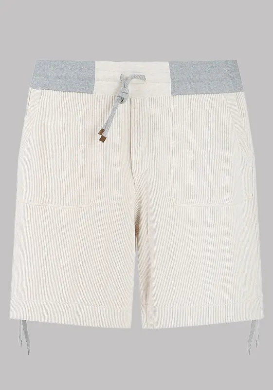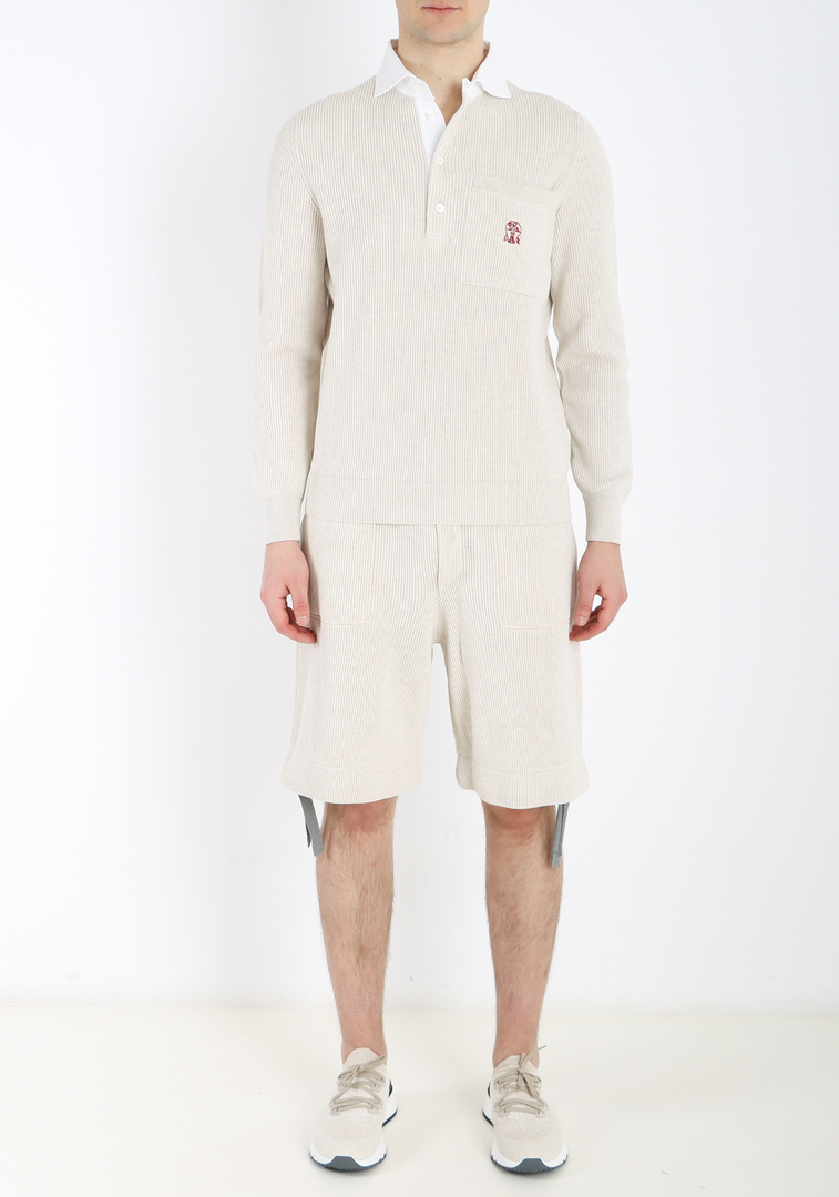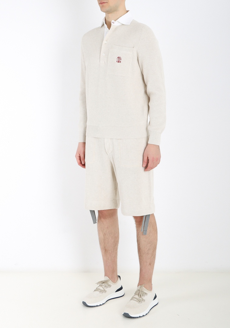 Шорты спортивные Brunello Cucinelli, бежевого цвета, выполнены из 100% хлопка, придающего им легкость и комфорт. Тонкая полоска в серо-голубом оттенке на поясе добавляет нотки элегантности, а двусторонние карманы обеспечивают удобство использования. Контрастная отделка пояса контрастирует с основным цветом, создавая динамичный силуэт. Широкий крой и свободный покрой делают эти шорты идеальным выбором для стильных прогулок и активного отдыха.