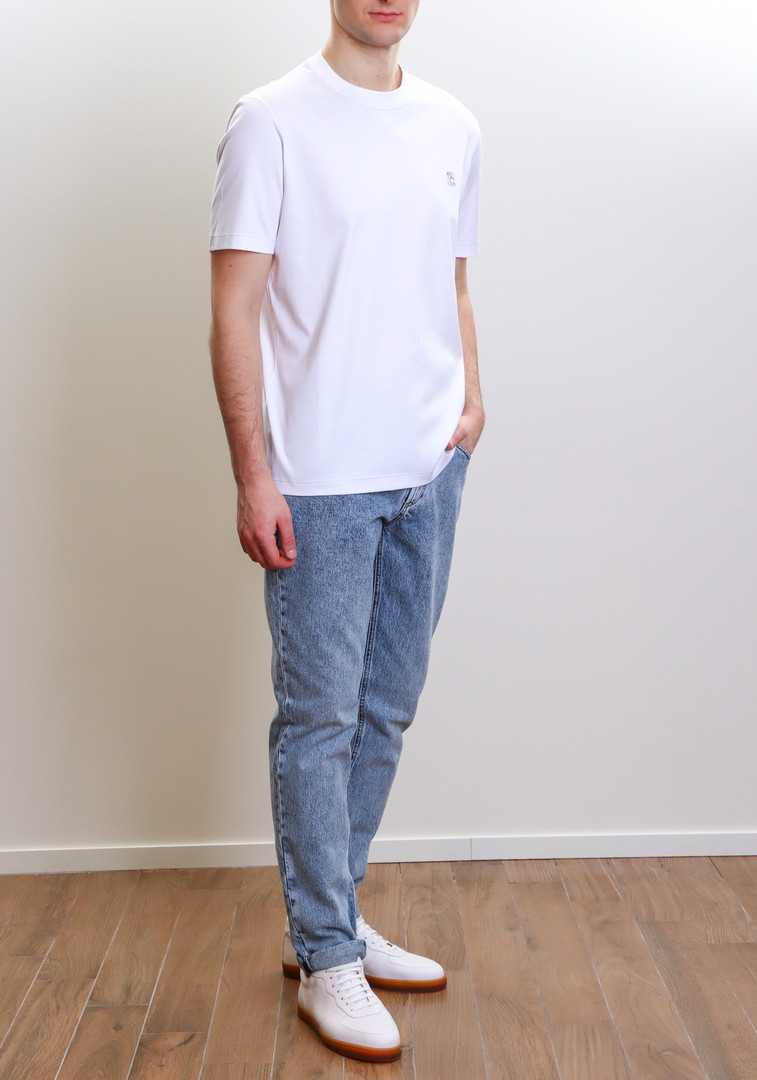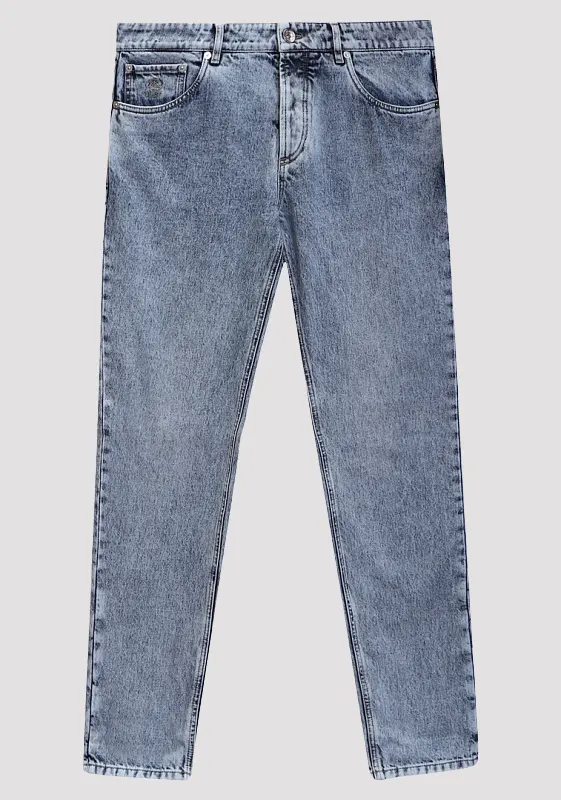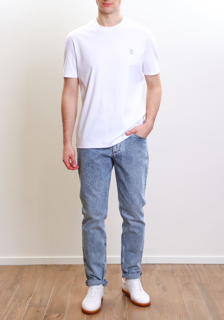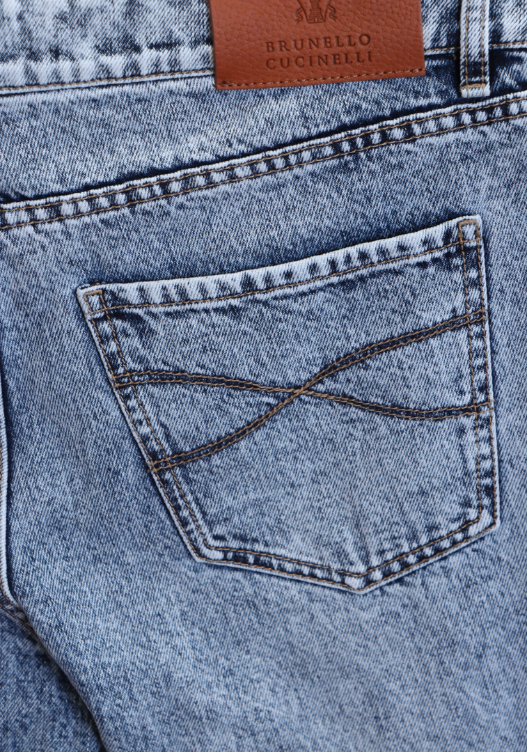 Джинсы Brunello Cucinelli, цвет синий, 100% хлопок. Тонкая джинсовая ткань придает модели легкость и элегантность, подчеркивая классический тренд унисекс. Стильный крой втачных карманов и отвороты на ногах создают актуальный силуэт, дополненный небольшими потертостями для эффекта изношенности.