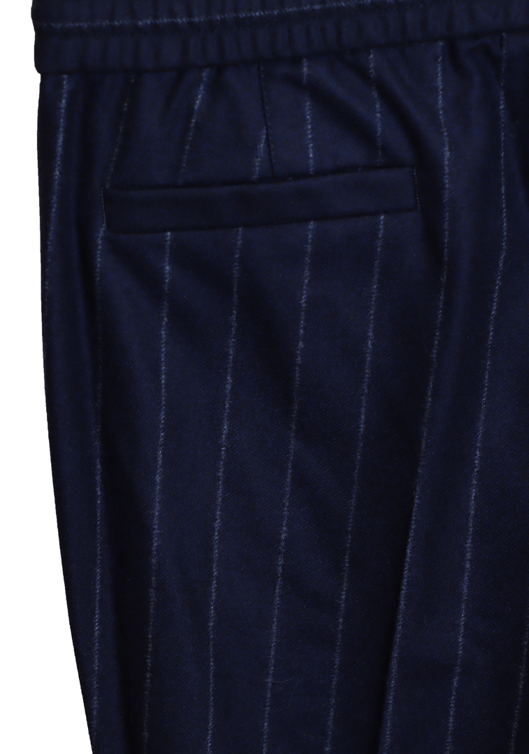 Брюки Brunello Cucinelli, темно-синего цвета, выполнены из 100% шерсти, придающей ткани элегантную текстуру. Стильные брюки слим-фит обладают лаконичным кроем и мягким хлопковым шнурком на поясе, украшенным небольшим оранжевым пуговицей.