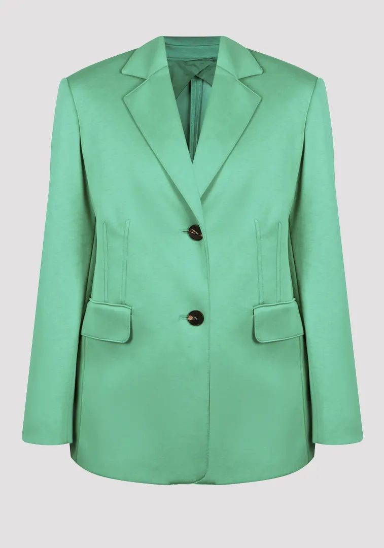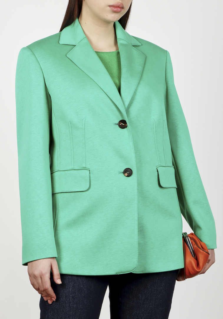 Жакет Marina Rinaldi, цвет зеленый, выполнен из 100% вискозы с подкладкой из 65% вискозы и 35% полиэстера. Ткань шелковистая, придающая жакету элегантную текстуру. Стильный крой приталенного силуэта обеспечивает комфорт и стильность. Двухпуговичная застежка и карманы на клапанах добавляют лаконичности и функциональности.