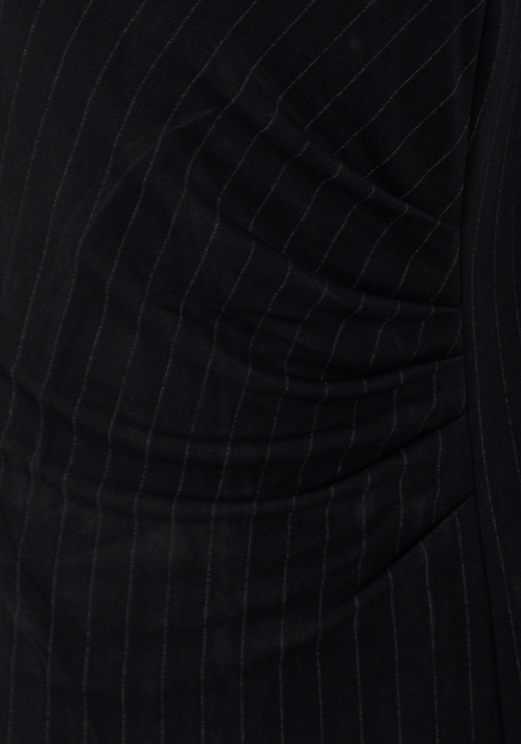 Платье Max Mara, черное, выполнено из комбинации нейлона и эластана. Тонкие вертикальные полоски придают текстуру, создавая эффект рельефа. Стильное платье с длинными рукавами и драпировкой на груди подчеркивает элегантность. Крой приталенный, с разрезом по боковой линии, обеспечивает свободу движений и актуальный силуэт.