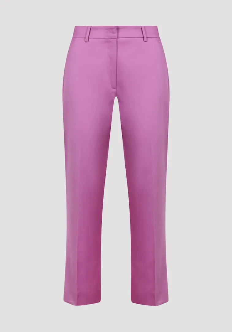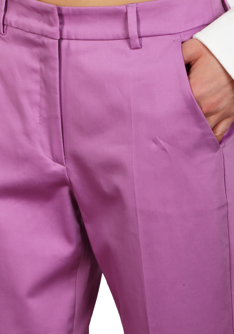 Брюки Max Mara Weekend, лилового цвета, выполнены из 98% хлопка и 2% эластана, обеспечивая комфорт и легкость. Ткань имеет матовую фактуру, подчеркивая элегантность модели. Стиль брюк лаконичен и актуален для современного гардероба, они имеют прямой крой с классической застежкой на пуговицы, что придает образу строгость и уверенность.