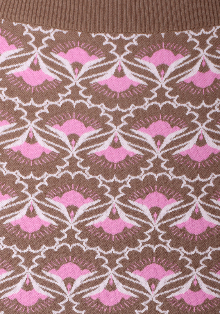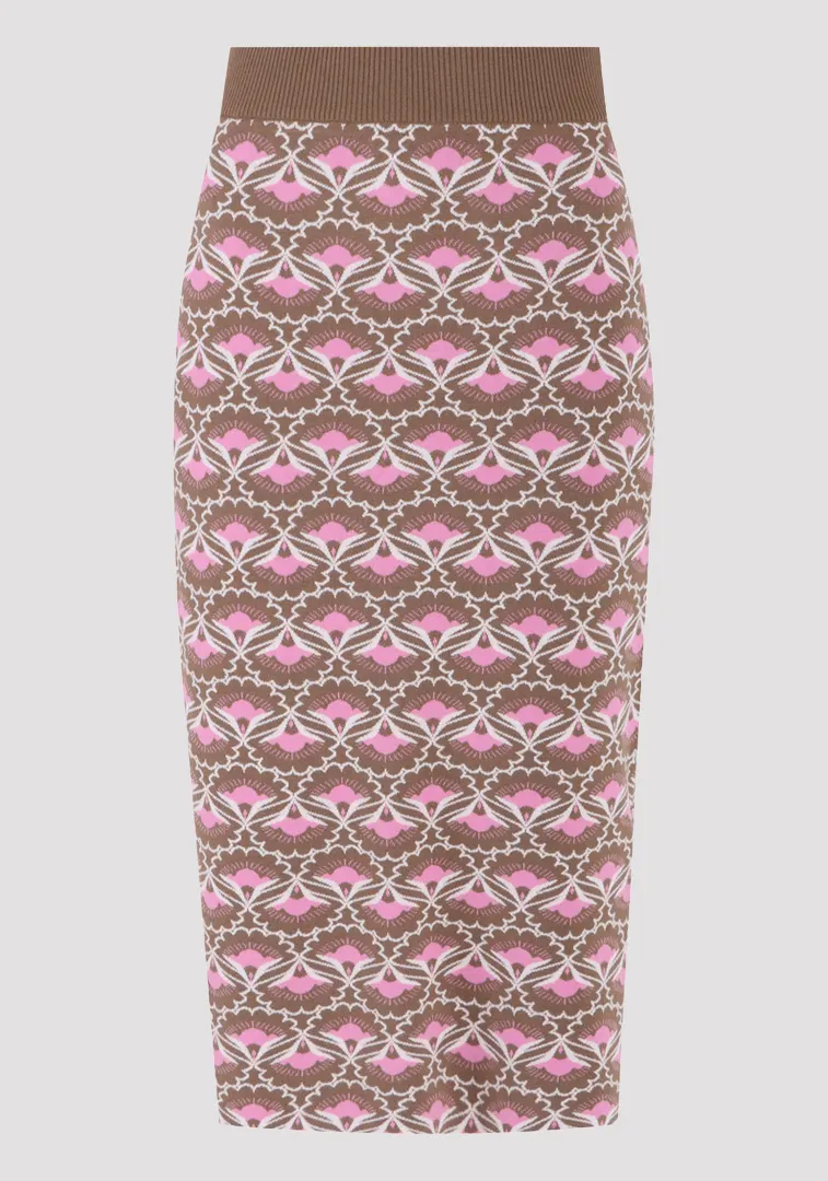 Юбка трикотажная Max Mara Weekend, цвет табак, 95% вискоза и 5% эластан создают легкую и элегантную текстуру. Декорирована изящным геометрическим узором в розовых оттенках, что придает модели современный тренд. Классический прямой крой подчеркивает стройность фигуры, обеспечивая комфорт и стиль.