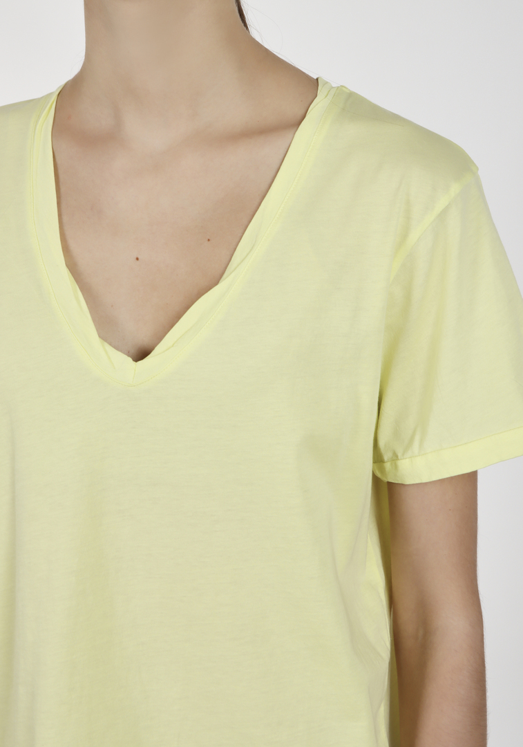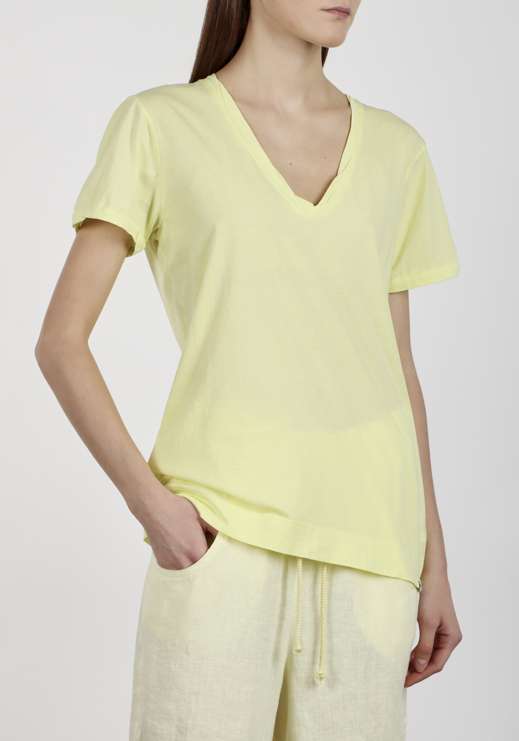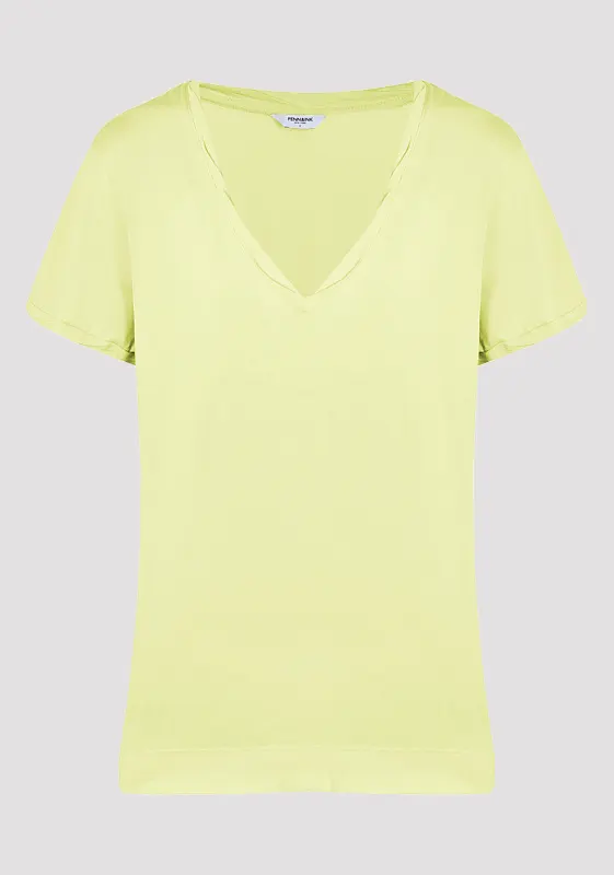 Футболка PENN&INK N.Y, цвет лайм, 100% хлопок. Элегантная модель с глубоким V-образным вырезом и короткими рукавами, выполненная в стиле минимализма. Тонкая фактура ткани придает изделию легкость и комфорт. Стильный крой подчеркивает стройность фигуры, создавая современный и элегантный образ.